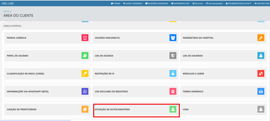 0.1.1 Escolha do submódulo: Após selecionar módulo ÁREA DO CLIENTE, o sistema irá abrir em uma segunda tela. Desça a tela até encontrar o título “MINHA EMPRESA” clique no módulo “ATIVAÇÃO DE AUTOCADASTROS”.