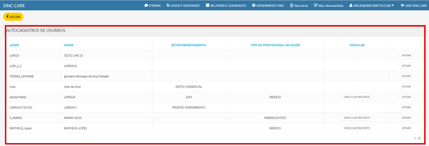 A imagem mostra a tela com uma lista de todos os usuários auto cadastrados, com as seguintes colunas: