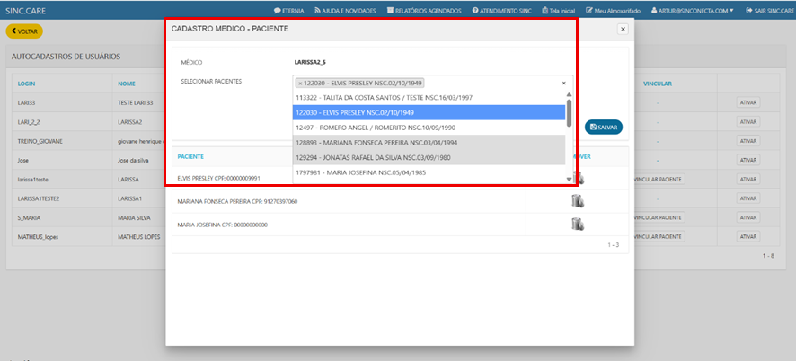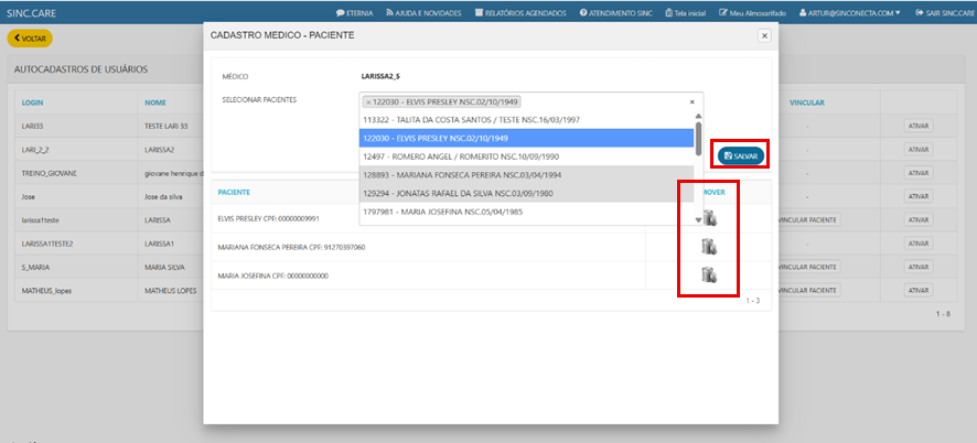 - Passo 3: Salvar: Após selecionar ou remover os pacientes, clique no botão "SALVAR" para confirmar as alterações e fechar a janela.
