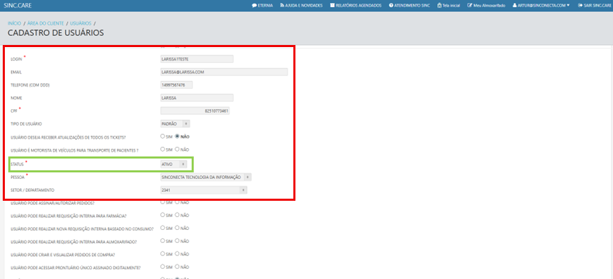 Observação: sempre que for cadastrar o usuário e ele for utilizar das ferramentas do sistema, marque o “STATUS” como ATIVO.