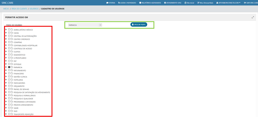 - PERFIL DO USUÁRIO: Você pode selecionar um perfil pré-definido (por exemplo, "FARMÁCIA") e clicar em "APLICAR PERFIL" para carregar um conjunto de permissões padrão.