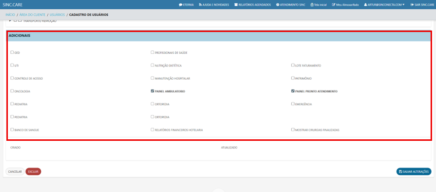 A seção "ADICIONAIS" oferece ainda mais controle sobre as permissões do usuário, com opções de caixa de seleção para funcionalidades específicas, como: