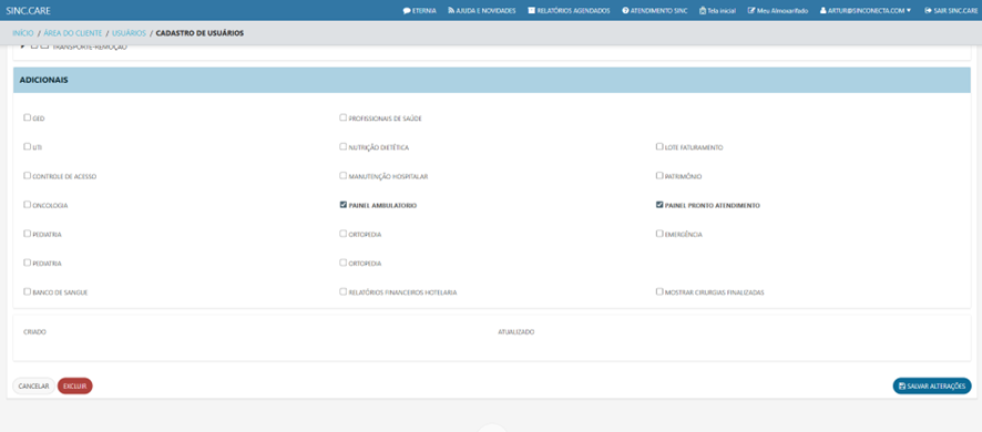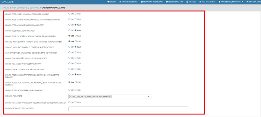 Além disso, é possível restringir o acesso a "Unidades Permitidas" e listar os pacientes que o usuário "ATENDERÁ SOMENTE ESTES PACIENTES".