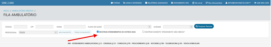 - A tela exibirá os filtros de busca (CPF, Plano de Saúde, Unidade, etc.) e selecione a opção “Mostrar atendimento de outros dias”.