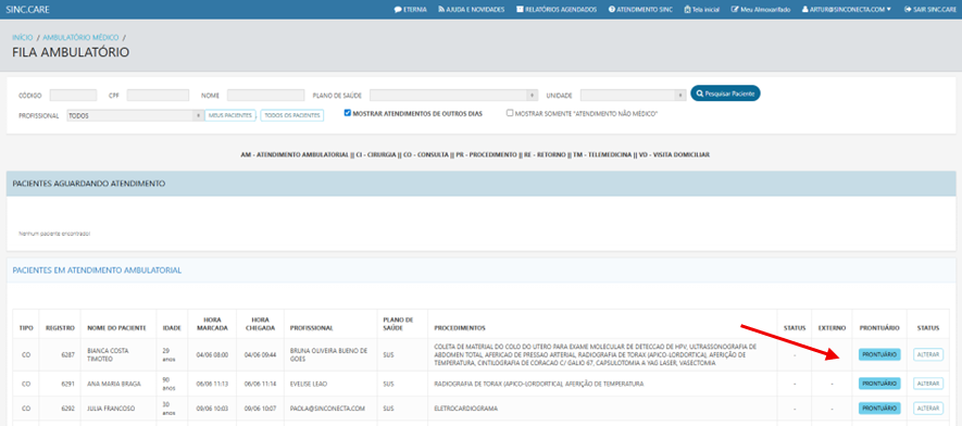 - Identifique o paciente desejado e clique no botão azul Prontuário, localizado na extremidade direita da linha do paciente.