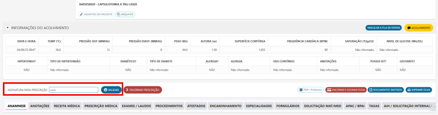 - DEVE SER VALIDADA A SENHA DO PROFISSIONAL NO CAMPO “Assinatura para prescrição”, após inseri-la clica no botão Validar.