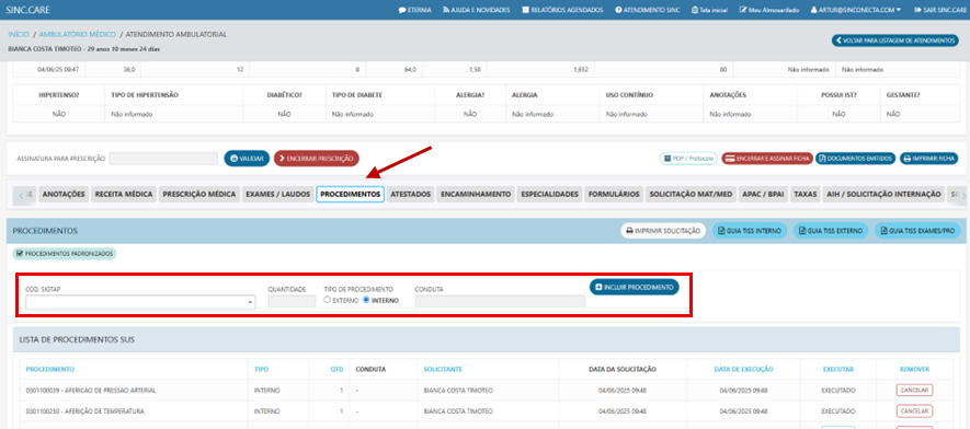 Como exemplo: Na barra de menus inferior do prontuário vá em “procedimentos” e preencha as informações necessários (Cod. Sigtap, Quantidade, Tipo de procedimento e Conduta) e clique em “Incluir Procedimento”, após isso ficará listado no sistema o procedimento.