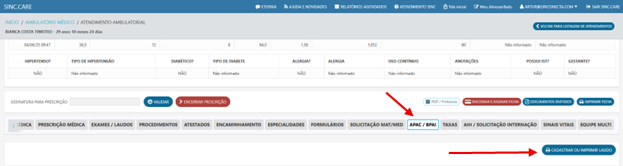 - Após isso, ainda na barra de menus inferior, vá em “APAC/BPAI” e selecione o campo “Cadastrar ou imprimir laudo”.