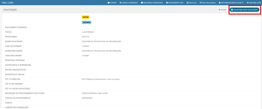 - Na próxima tela selecione o botão “Cadastrar nova solicitação”.