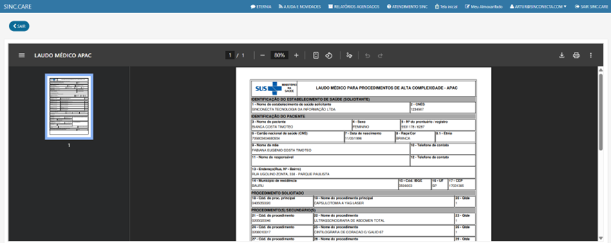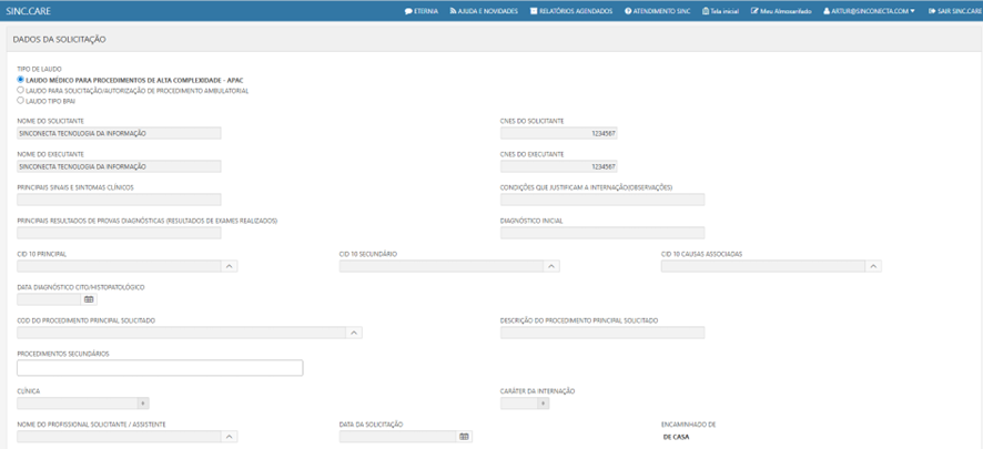 - O sistema abrirá o formulário digital padronizado pelo SUS (solicitação da APAC), basta preenche-lo e confirmar a final da página “Gerar solicitação”.